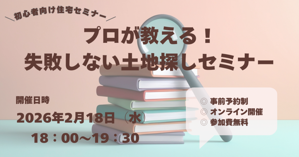 土地探しは家づくりの中でも特に難しい工程ですが、正しい知識と判断基準を持つことで、失敗を大きく減らすことができます。「プロが教える!失敗しない土地探しセミナー」では、土地探しの基礎から実践的なチェックポイントまで、初心者でも理解しやすい形で学べる内容になっています。